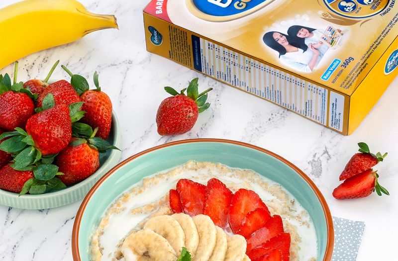 Salah satu bahan yang tidak kalah penting pada resep Strawberry Banana Oatmeal ini, yaitu Bebelac Gold. Susu Bebelac Gold dengan Advans Fiber dapat membantu mengurangi risiko konstipasi, membantu memenuhi kebutuhan serat, serta mendukung perkembangan otak agar si Kecil menjadi anak hebat.[3]